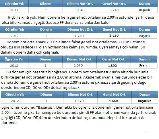 * Örnek üzerinden anlatacak olursak; geçen dönem (bu sene güz) koşullu geçilen derslerin durumu, bu dönem sonundaki GNO’ya göre belli olacak. Geçen dönem GNO’su 2.00’nin altında kalarak “uyarı” alan bir öğrenci, bu dönem yine 2.00’nin altında kalırsa başarı durumu “tekrar” olur ve GEÇEN DÖNEMKİ koşullu derslerden kalır. BU DÖNEMKİ KOŞULLU DERSLERDEN HENÜZ KALMAZ. Bu dönemki koşullu derslerin durumuna gelecek dönem sonunda (seneye güz) bakılır.